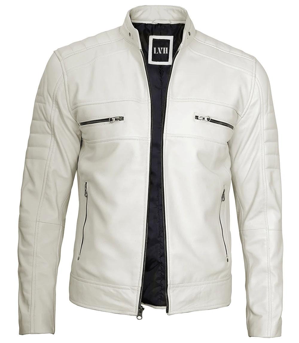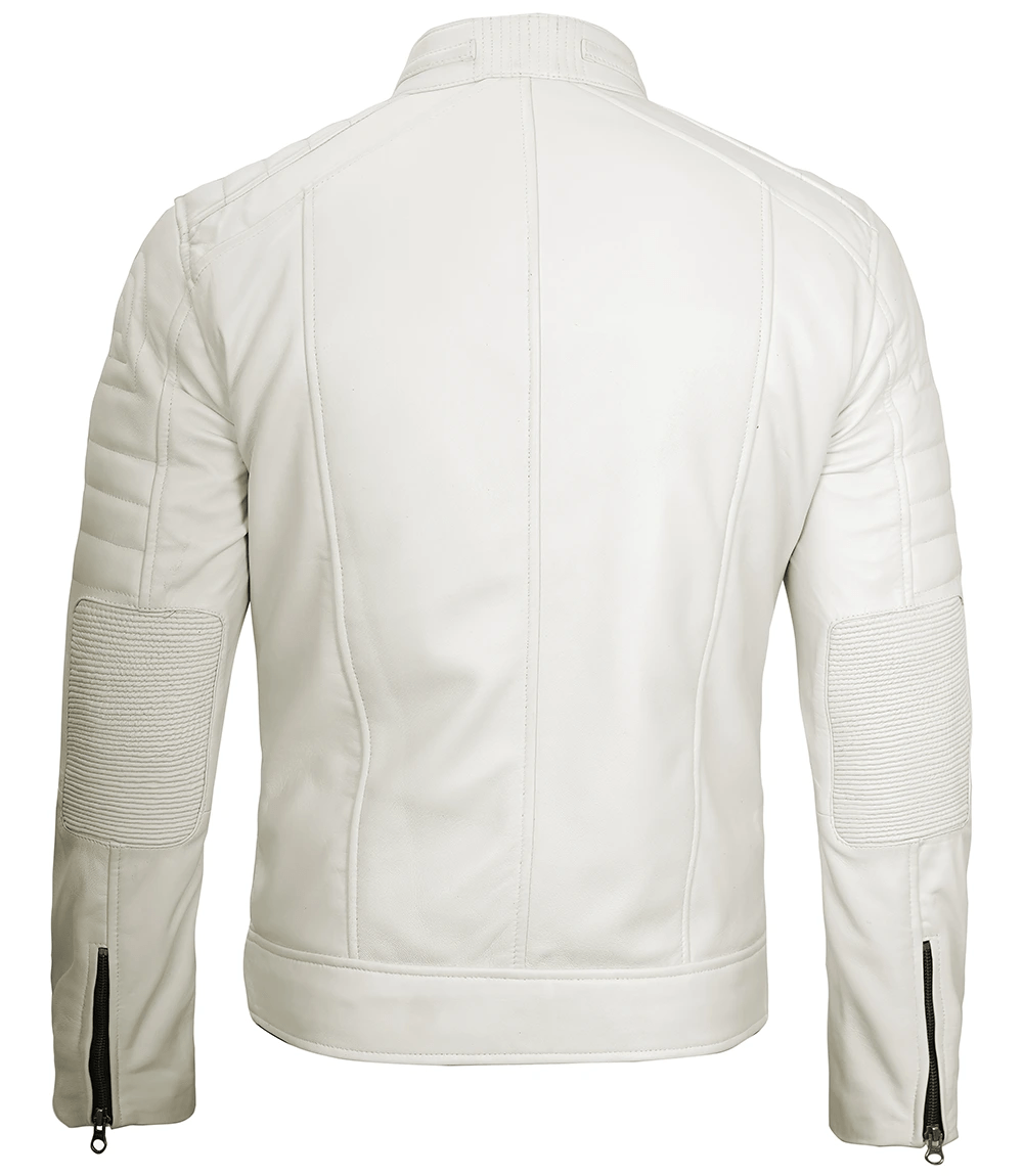 The Men Racer Off White Real Leather Jacket front wears a stylish look that certainly makes the man. Its clean white color and an upfront sleek design give a modern and edgy vibe to whoever wears it. Made out of genuine lambskin leather, this jacket is not only comfortable but also durable enough. Versatile and timeless like that, this piece would surely nail a laid-back or dressed-up look.