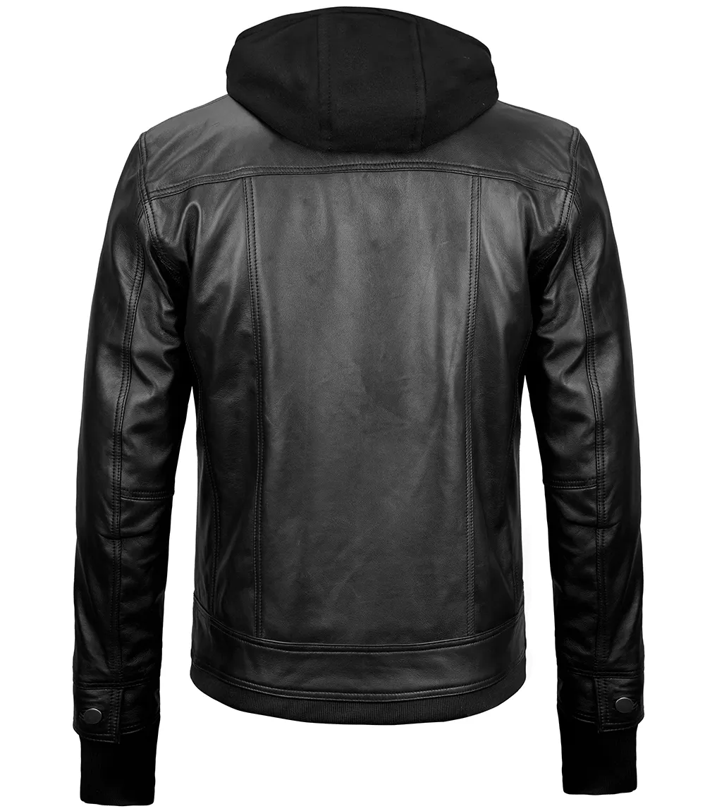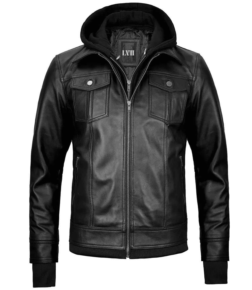 Keep yourself in vogue with this trendy black leather bomber jacket with a detachable hood, designed to be functional for your daily activities. It’s made from high-quality real leather with a soft internal polyester lining for maximum comfort.