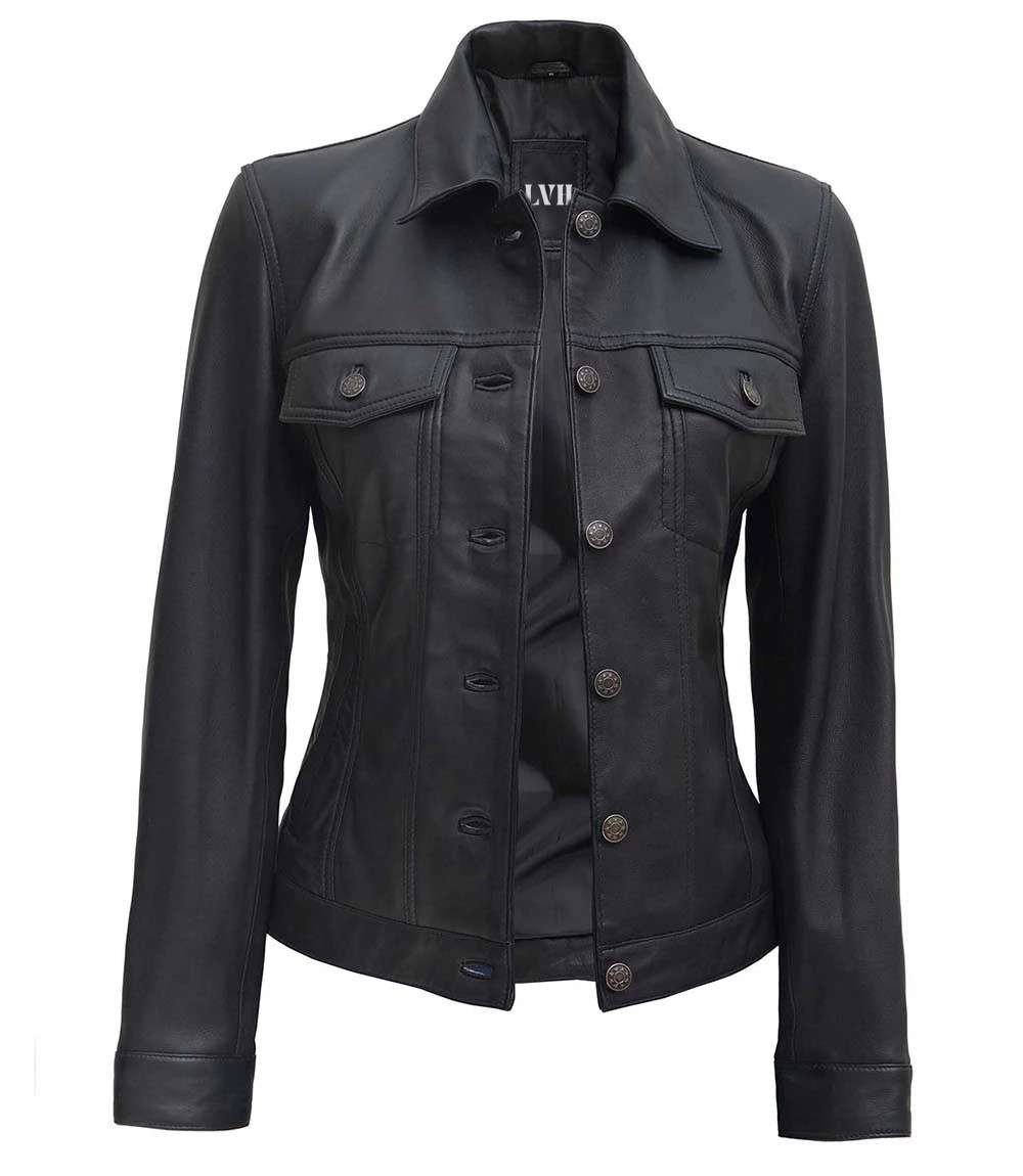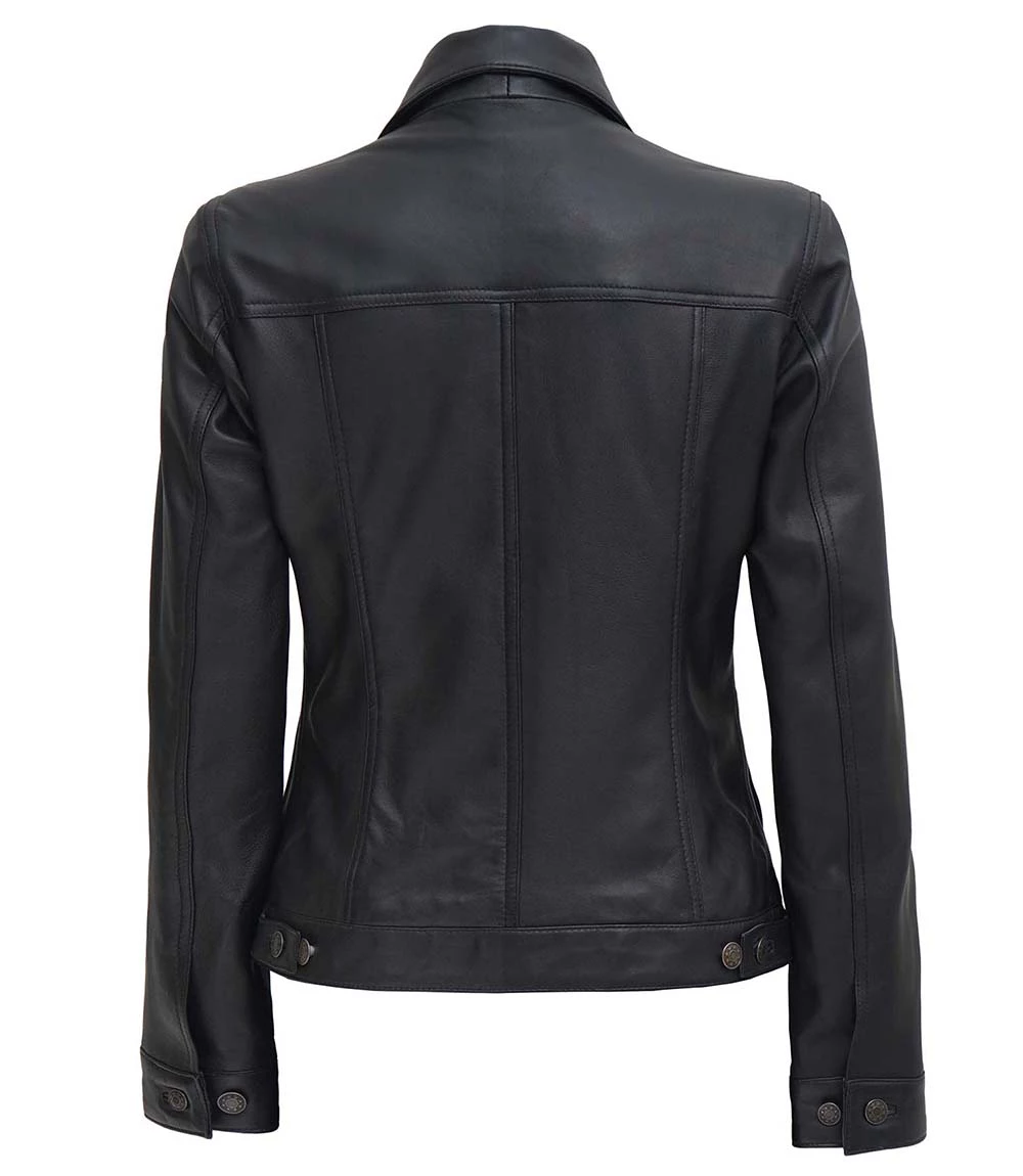 This Women’s Black Four-Pocket Trucker Leather Jacket is perfect for your everyday style. Made from vegan leather with a warm polyester lining inside, it offers a refined look that’s built to last. This jacket is a lasting statement piece for any wardrobe.